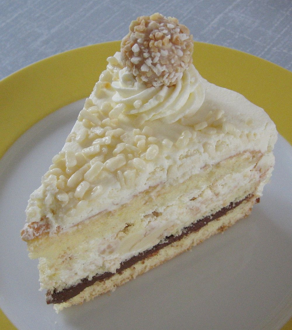 Dann zwei Rollen Mandel-Giotto zerdrückt und mit 1 Becher Sahne vermischt, diese Masse auf den Boden gestrichen, dann den Deckel aufgesetzt, die Torte rundum mit Sahne bestrichen und Tupfen gespritzt, dann kurz vorm Servieren nochmal Mandel-Giottokugeln auf die Tupfer setzen....